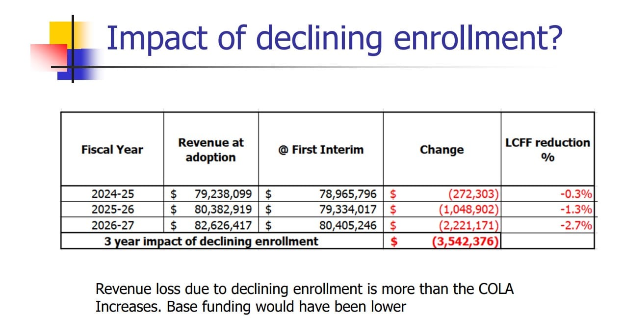 The First Interim Report on the 2024-25 CCUSD Budget was also presented to the previous iteration of the Board on December 10. It showed that the projected budget will have even less money over the next several years than expected due to the projected drop in attendance.