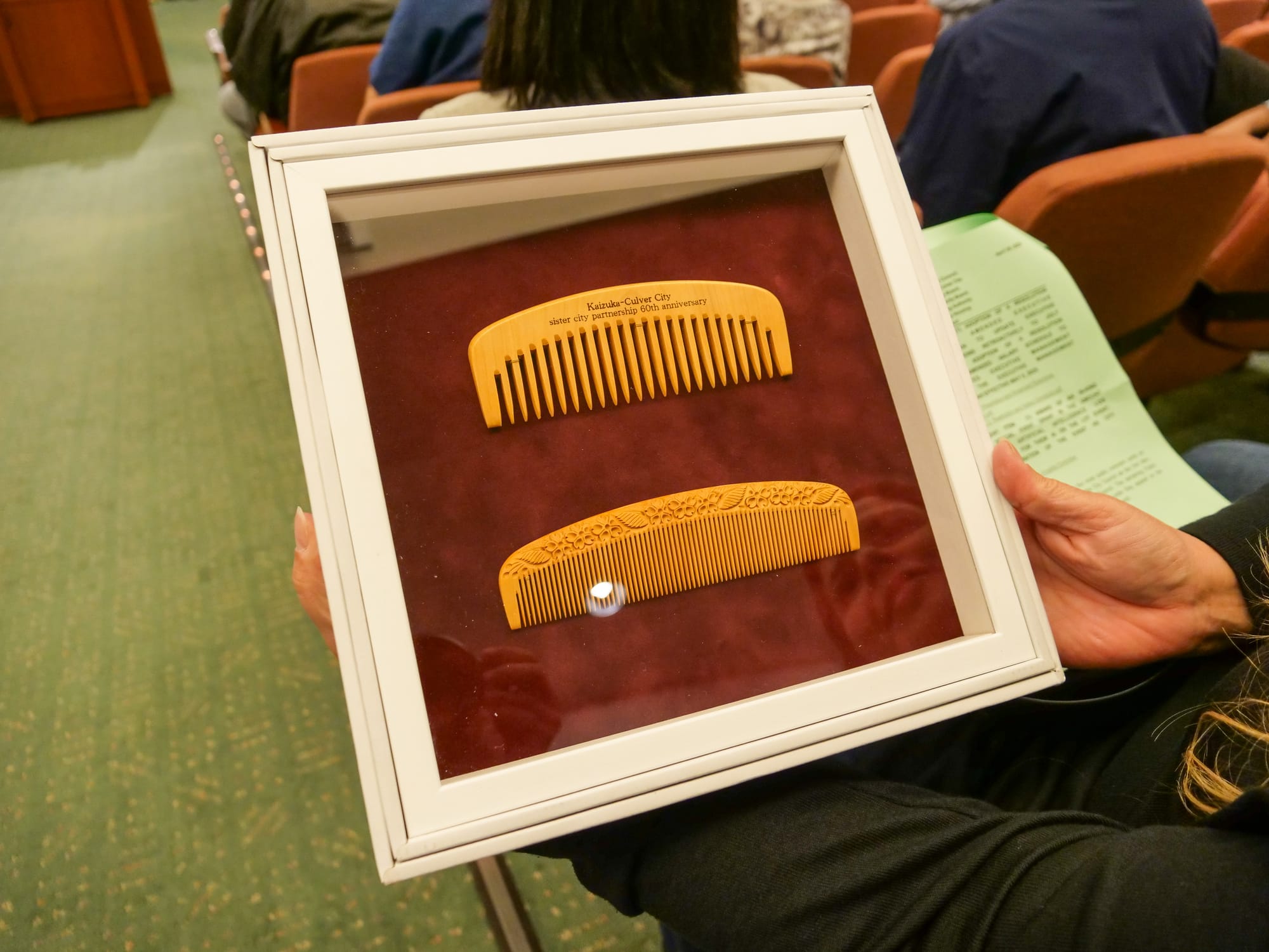Terada presented Culver City Mayor Dan O'Brien with a pair of wooden combs celebrating the relationship between Kaizuka and Culver City. He also gave a quick address to the city council and audience members in English, showing appreciation for the long relationship between Kaizuka and Culver City.