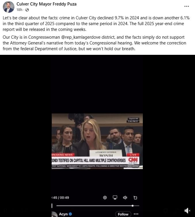 Culver City Mayor Freddy Puza and other elected officials responded to comments made by Attorney General Pam Bondi on the city, rejecting her criticisms as unfounded. Bondi referred to Culver City by name when discussing crime in U.S. Representative Sydney Kamlager-Dove’s Congressional District, and public representatives of Culver City’s community unanimously rejected and denounced her critique.