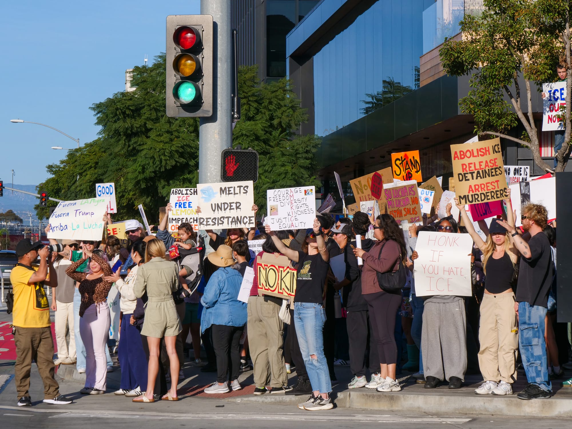Students from Culver City High School organized a protest last Friday that joined a larger movement to speak out against the recent actions of U.S. Immigration and Customs Enforcement (ICE) officers that have resulted in the deaths of several U.S. citizens seen as legal observers or innocent of any crime attributed to them. The crowd of protestors, originally planning to organize at the Culver Steps on Friday, spilled beyond the Town Plaza into the Culver Boulevard center divider and the adjacent streets.