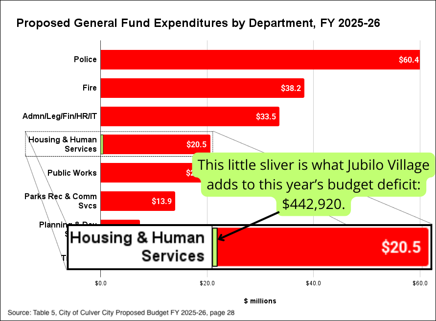 The deficit is the real problem because it's going to deplete our reserves in a few years. So, how does Jubilo Village impact the yearly general fund deficit? Well, because nearly all of the money for Jubilo Village comes from restricted funds and reserves, less than $500,000 from the general fund will go to Jubilo Village in fiscal year 2025-2026 — a drop in the bucket compared to the broader budget.