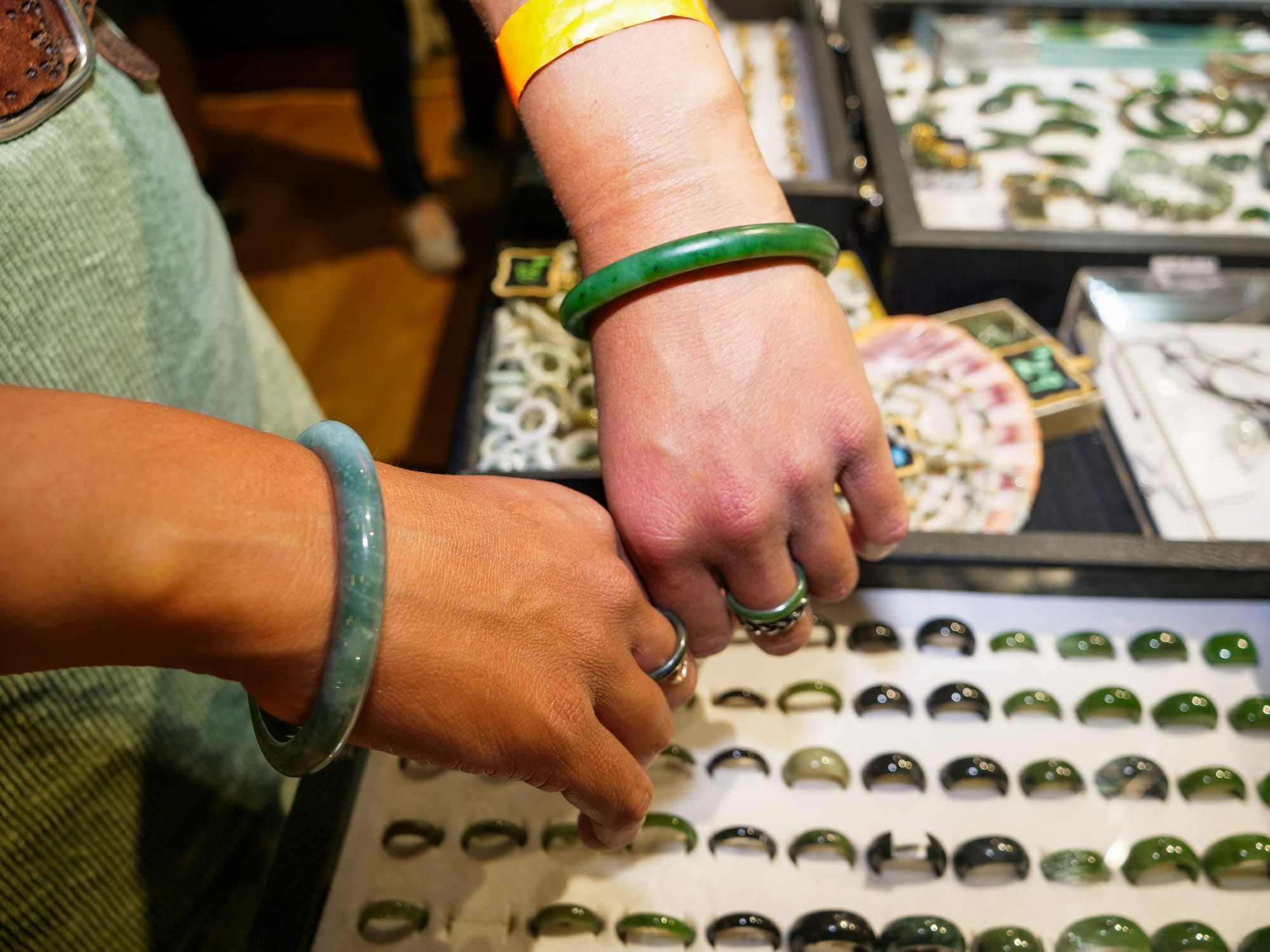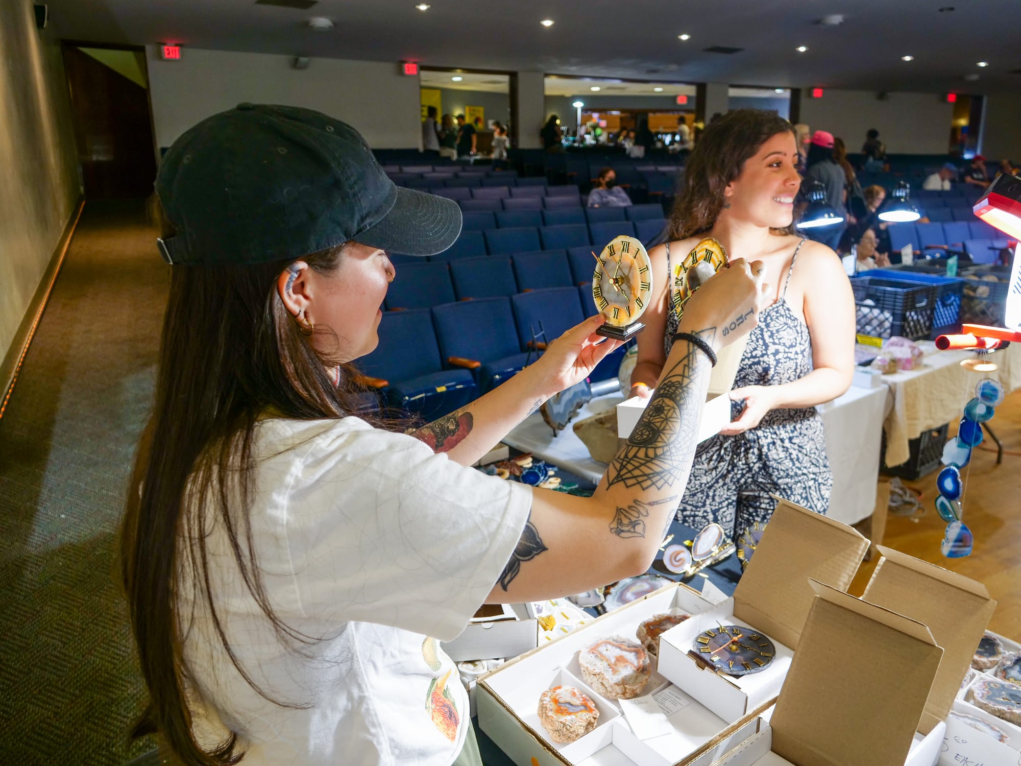The 62nd Annual Culver City Fiesta of Gems held this past Saturday and Sunday, June 28 and 29, featured brilliant gemstone and mineral-centered creations, including these displays. The vendor told Culver Crescent that the base molds are crafted by hand to mold around each crystal, with bends and folds that wrap around the rock clearly present. || Photos by Christian May-SuzukiThe featured mineral chosen by the event's host — the Culver City Rock and Mineral Club — was fluorite, the mineral form of calcium fluoride. It is considered to have one of the widest range of colors of any mineral in the world, and these different hues can be the result of impurities, radiation, or other environmental factors. || Photo by Christian May-Suzuki Tools to cut and shape minerals and rock were among the practical products sold by vendors at the Culver City Fiesta of Gems, which was held Saturday and Sunday at the Veterans Memorial Center. Demonstrations and workshops which showed attendees how to work with these tools were among the attractions at the Fiesta. || Photo by Christian May-Suzuki While fluorite can be known to have color gradients, this bismuth is a different entity entirely. It is actually considered a chemical element, not a rock or mineral, and can be found of the Periodic Table of Elements as atomic symbol 83. || Photo by Christian May-Suzuki Some vendors turned their minerals into unique products, like these unique functional clocks made from the cross section of minerals. While the most common goods at the Fiesta were jewelry made from various minerals and gemstones, other practical products like these clocks were also available for purchase. || Photo by Christian May-Suzuki An employee of vendor Jade and Jewelry shows off the differences in her Jade bracelets at the Fiesta of Gems. Jade comes in a variety of shades based on where it originates, and can come from two different rocks: nephrite and jadeite. Jadeite is harder and denser than nephrite and is mainly found in Burma, while nephrite is much more abundant. || Photo by Christian May-Suzuki One of the most unique pieces at the Fiesta was these wire trees, produced by Ferdie Sanchez of Gem Tree Creations. A four-hour workshop that taught the basics of making these "Rock Trees of Life" was also held at the Fiesta, but it was not taught by Sanchez. || Photo by Christian May-Suzuki A vendor shows off his collection of agate stones for a customer interested in purchasing a piece for his younger relative. Agate is a classification of quartz-based stones that are made of tiny crystals that are too small to be seen with the naked eye. || Photo by Christian May-Suzuki Agate is characterized by the bands of colors that are created through the alternating layers of silica that characterize this mineral. According to environmental firm Geo Forward, agate is "generally understood not to be a mineral, but rather a mineraloid due to its amorphous physical properties and geochemical composition." || Photo by Christian May-Suzuki Among the most commonly known gemstones, amethyst is a violet quartz variety which attributes its trademark purple color to trace amounts of Iron (Fe³⁺) incorporated into the crystal structure during formation. || Photo by Christian May-Suzuki