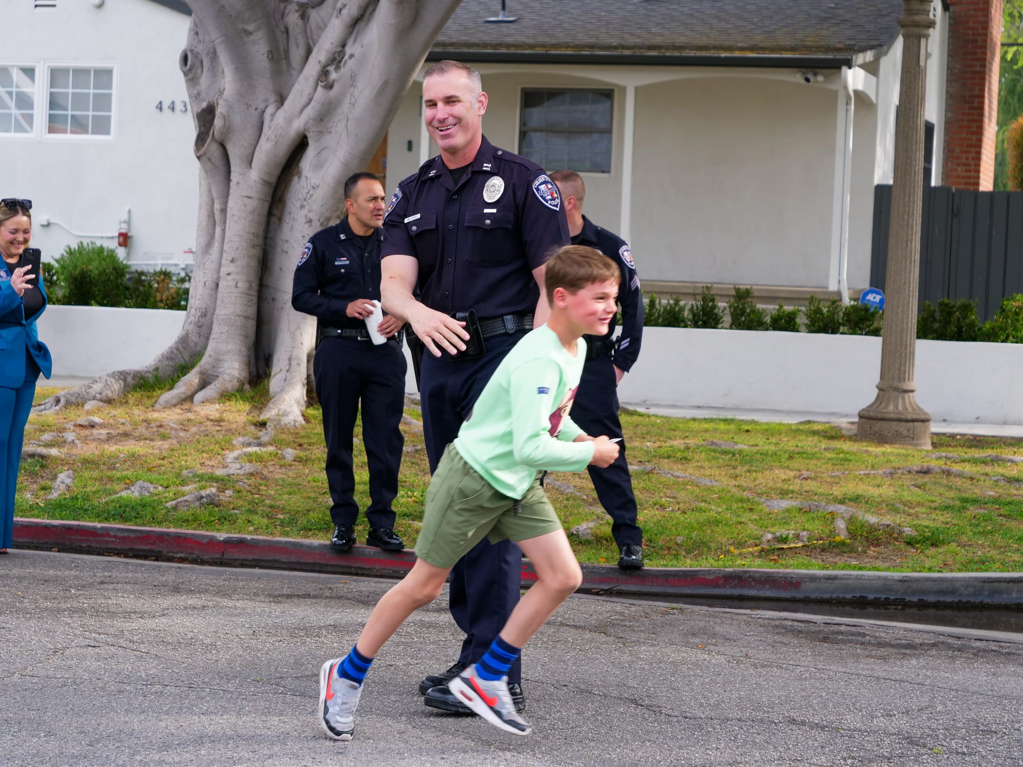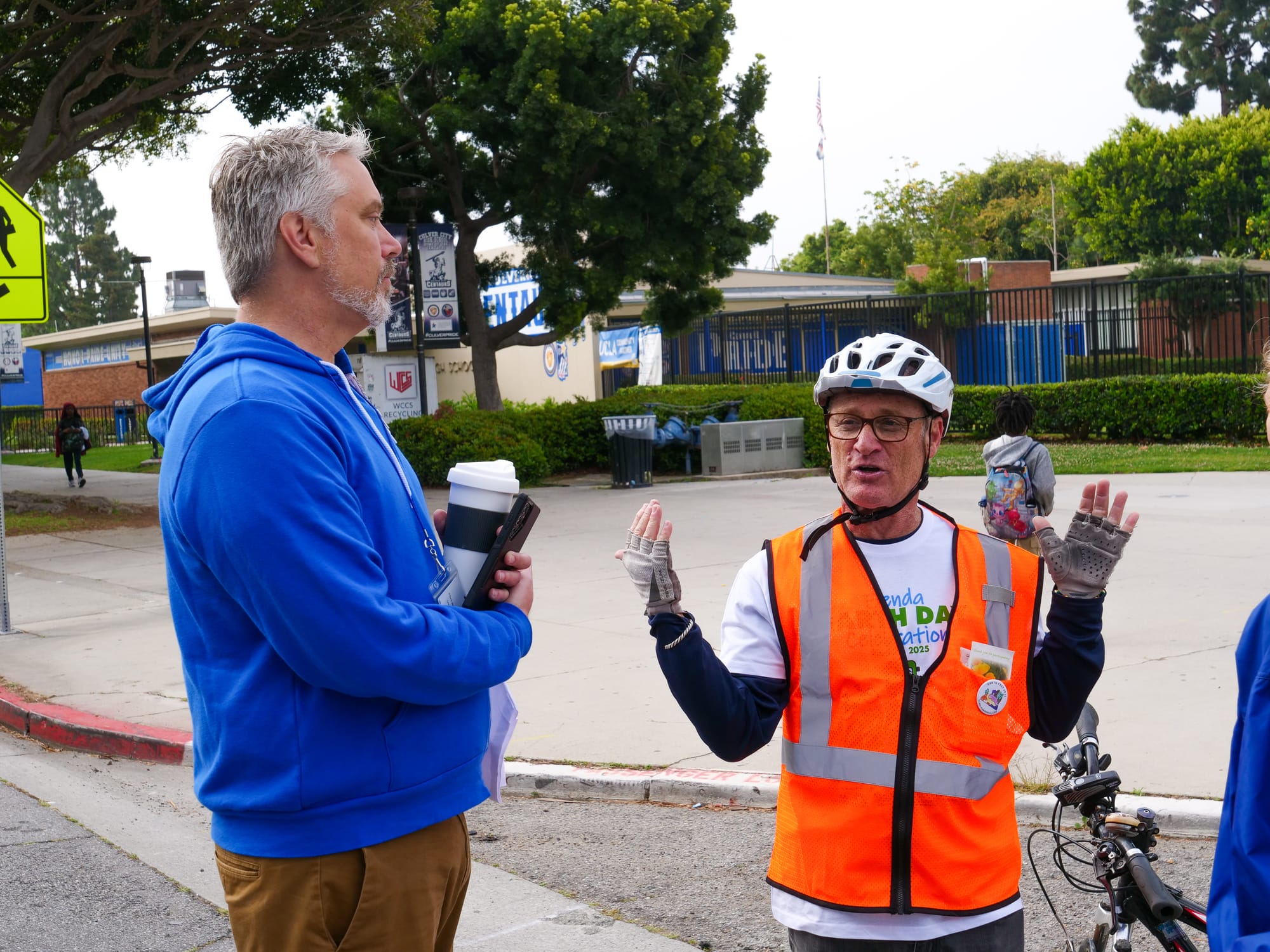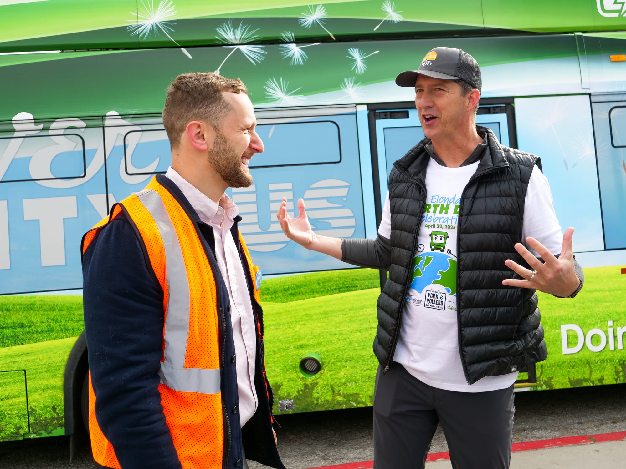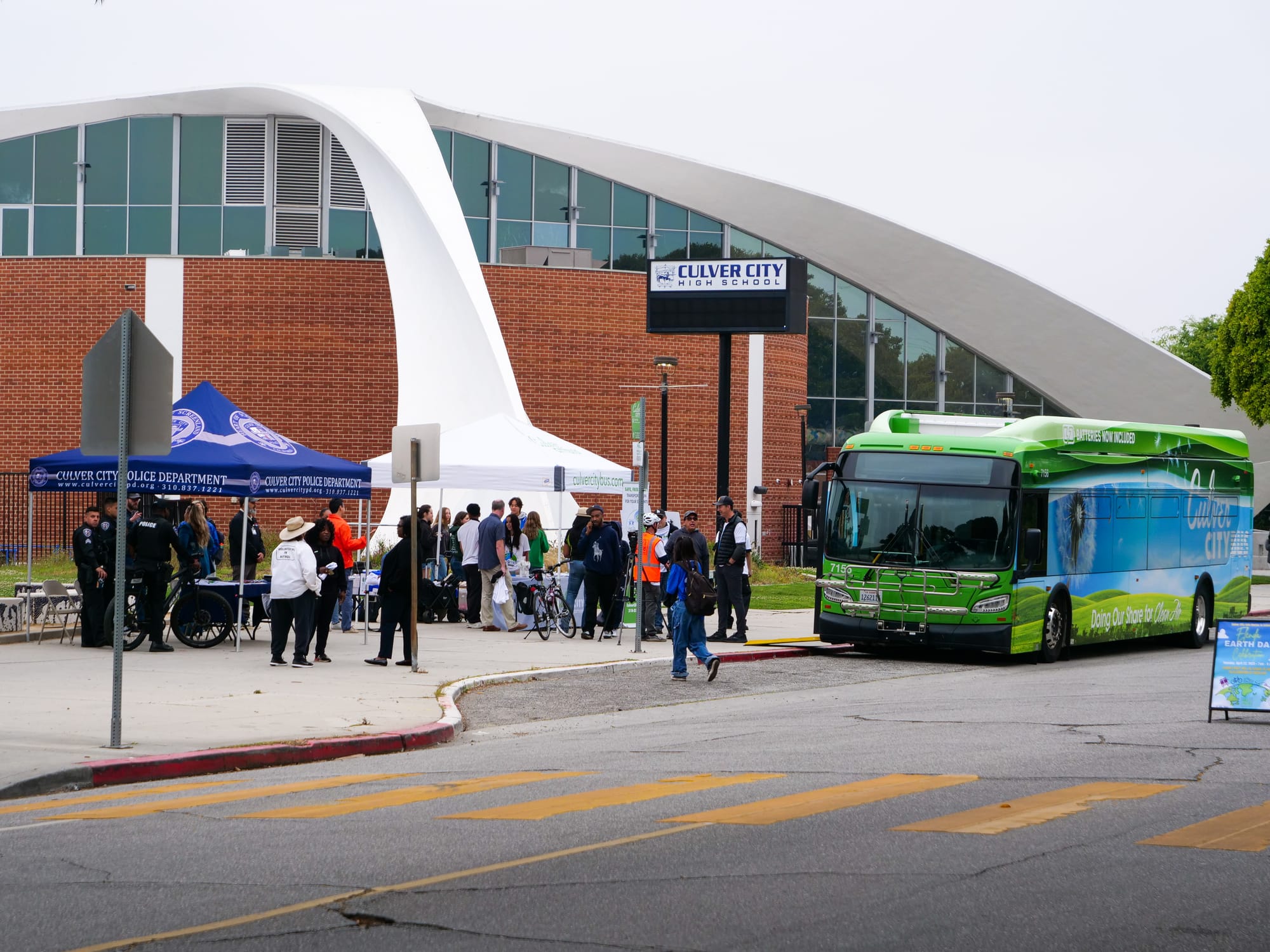 Students rode scooters and bikes along the car-free Elenda Street on the morning of Tuesday, April 22, to get to school. Instead of dropping students directly in front of Farragut Elementary, Culver City Middle School, and Culver City High School, parents were given suggested drop off points near the schools like the Wende Museum and Veterans Memorial Complex Parking Lot. || Photo by Christian May-Suzuki Along with the Culver City Police Department, Culver CityBus was stationed in front of Culver City High School to gather feedback from passing students for the Culver City Your Way project on Tuesday, April 22, which is part of the city's efforts to create the Comprehensive Mobility Service Plan. While city departments participated in the Elenda Street Earth Day Celebration, it was local nonprofit Walk 'n Rollers who conceived the event. || Photo by Christian May-SuzukiThe streets were not reserved for students, as several people took their dogs out for walks in front of CCUSD's three-school complex to enjoy the Elenda Street Earth Day Celebration on Tuesday, April 22. Organizer Jim Shanman told Culver Crescent that he would love to see the car-free zone extend to Coombs Avenue and Huron Avenue, though he admits money and other concerns could interfere with that vision. || Photo by Christian May-SuzukiWalk 'n Rollers founder and executive director Jim Shanman was the driving force behind the organization of this Elenda Street closure for the Earth Day Celebration on Tuesday, April 22, seen here talking to Culver City Unified School District Superintendent Dr. Brian Lucas. Shanman called Tuesday's event a successful venture and told Culver Crescent he hopes this shows parents that their students do not have to be dropped off directly in front of school each morning, arguing the extra walk or bike ride to school is healthy for kids. || Photo by Christian May-SuzukiMayor Dan O'Brien talks with councilmember Bubba Fish in front of a Culver CityBus at Culver City High School during the Elenda Street Earth Day Celebration on Tuesday, April 22. The city worked with Walk 'n Rollers and allocated $15,000 to help manifest the street closures, which lasted from 7 a.m. to 9 a.m., for the event. || Photo by Christian May-Suzuki Culver City High School's Associated School Board (ASB) gave Earth Day-themed pins to students on the sidewalk in front of Robert Frost Auditorium during the Elenda Street Earth Day Celebration. The ASB is the CCHS student council that helps organizes events and has representatives at Board of Education meetings. || Photo by Christian May-SuzukiCulver City Police took an active role in the Elenda Street Earth Day Celebration on Tuesday, April 22. On top of managing traffic, officers had a visible presence and interacted with the residents who passed by. || Photo by Christian May-SuzukiCulver City Police Officers were stationed at the various entry points to Elenda Street between Farragut Drive and Culver Boulevard to ensure motor vehicles stayed clear of the car free zone during the Elenda Street Earth Day Celebration. Some parents dropped their kids off in the parking lot adjacent to Farragut, but most were redirected to other streets. || Photo by Christian May-Suzuki