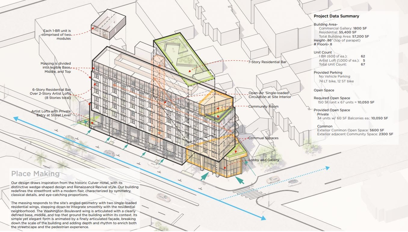 Of the 67 units in the proposed project, 61 are one-bedroom units reserved for income levels between 30% and 80% of the Area Median Income (AMI), and it offered the greatest proportion of units reserved for the 30% AMI bracket among the proposals presented. Aside from the manager's unit, the other five units are the two-bedroom artist lofts, which Planning Commissioners acknowledged as a feature that many Culver City residents are excited about.